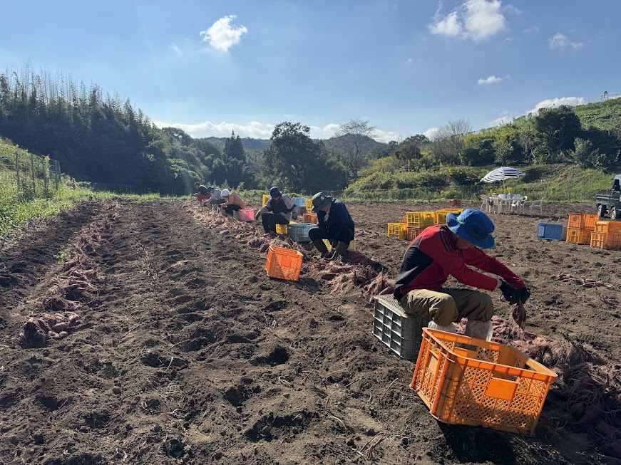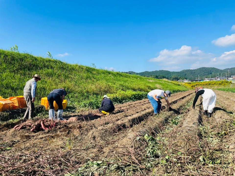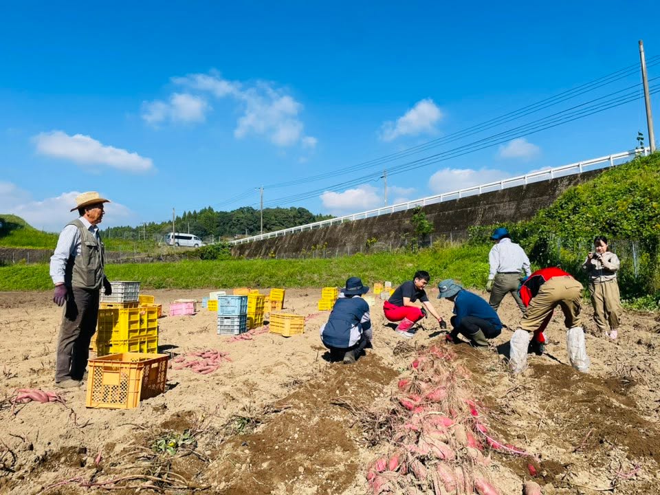 続いて訪問したのは、犬飼町の農泊「優しい時間」です。さつまいも農家として、20年以上ホームステイの受入や農泊を営む、足立さんの畑でさつまいもの収穫体験をさせていただきました。
